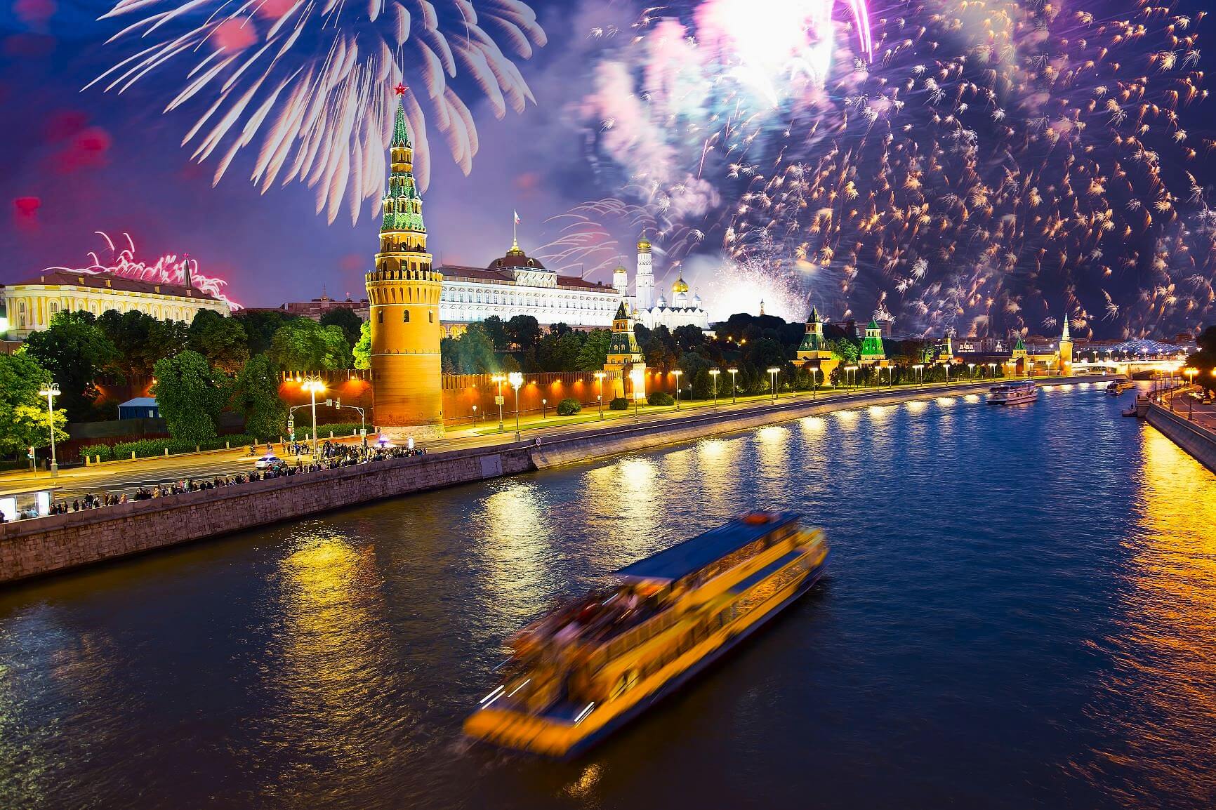 Приглашаем Вас насладиться увлекательной речной прогулкой по самому центру города с просмотром праздничного городского салюта. Праздничный рейс по Москве-реке 9 мая будет включать в себя вечернее путешествие через центр города, замечательные виды на главные достопримечательности столицы в ночной иллюминации, а также праздничный фейерверк, который будет прекрасно виден с лучшей точки обзора — с акватории реки.