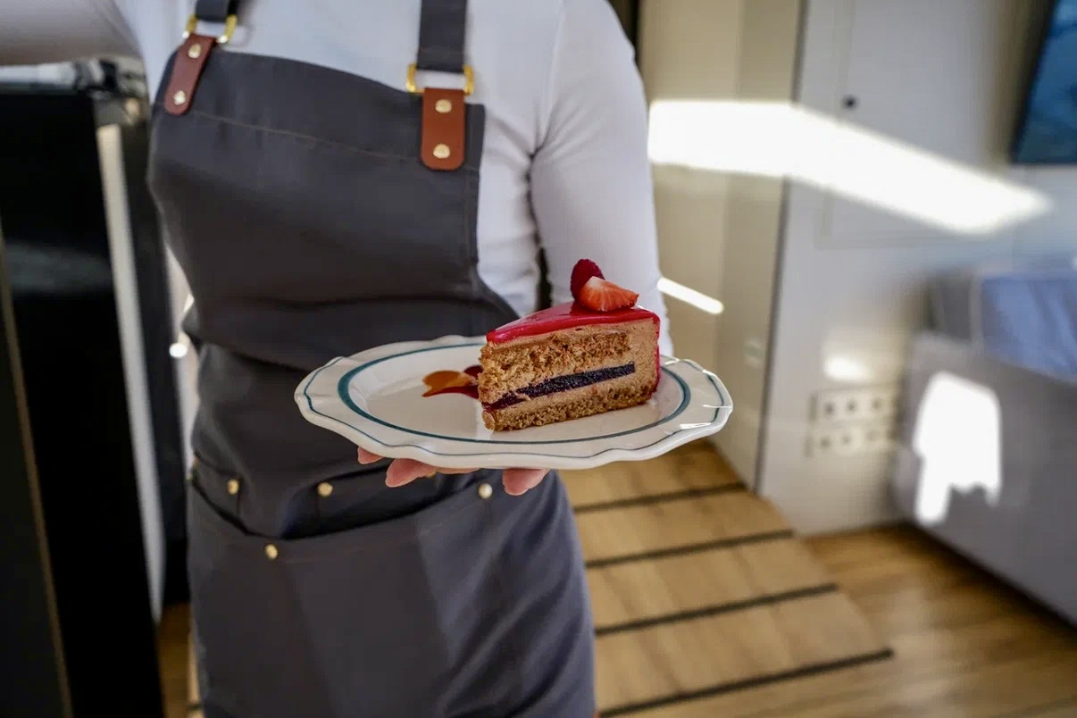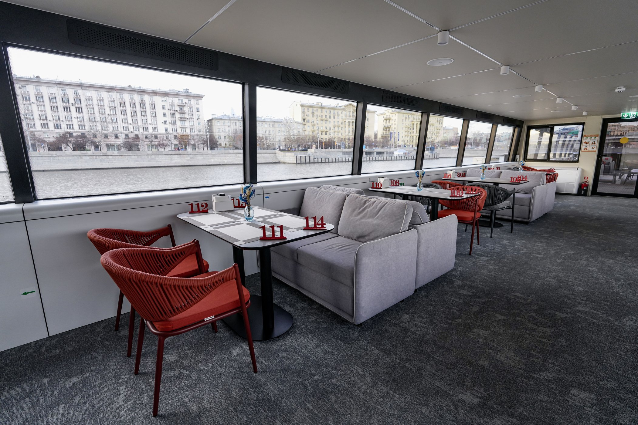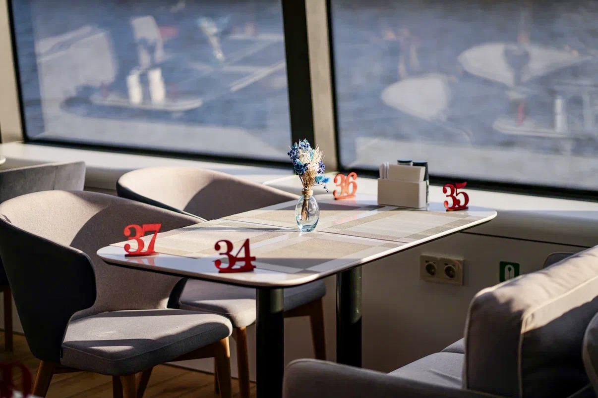 На борту работает полноценный ресторан, где каждый рейс превращается в гастрономическое путешествие по Москве-реке.